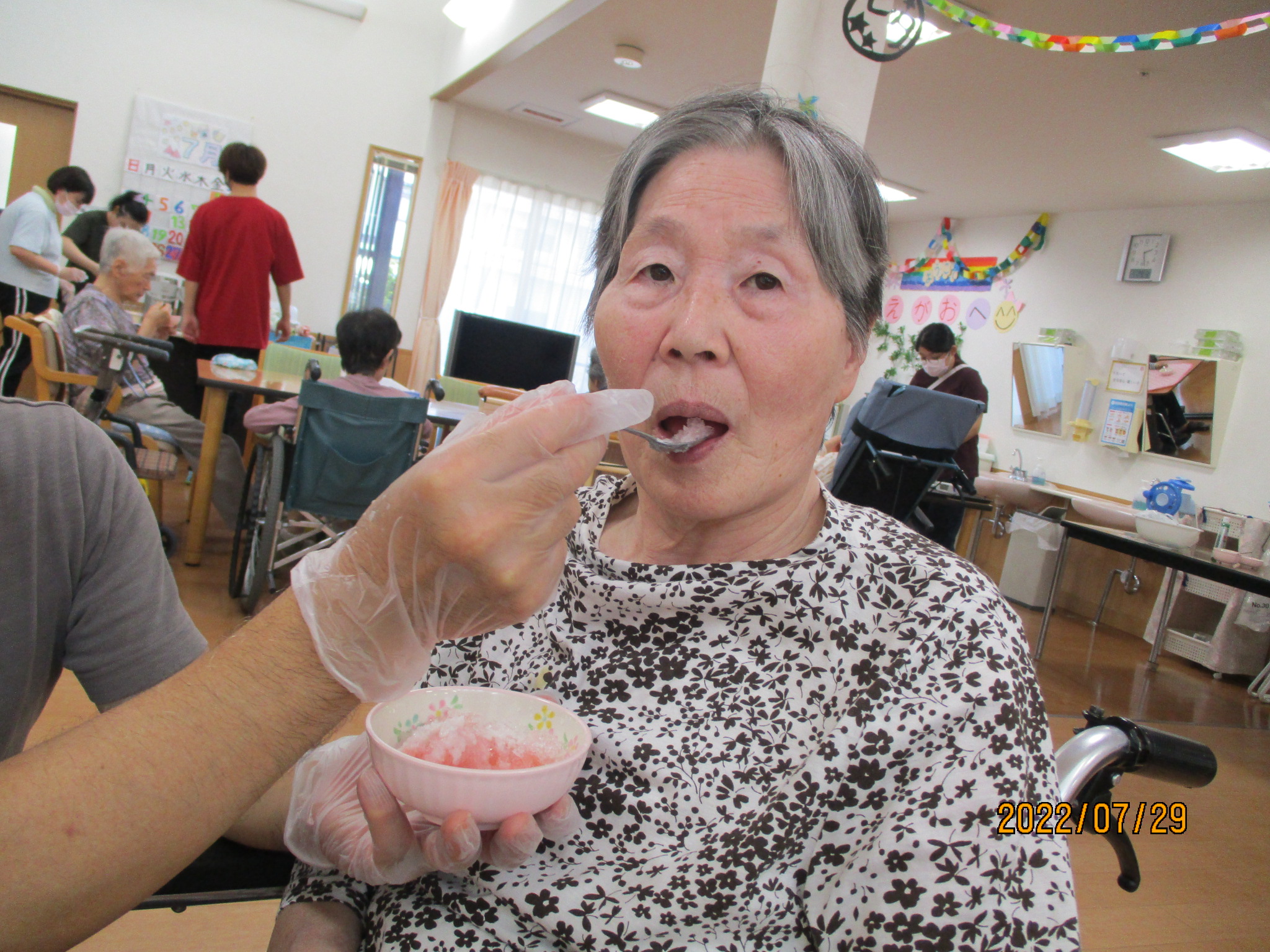 外は炎天下34℃ ショートステイえがおの室温26℃ イチゴ・メロン・ブルーハワイとお好みのリクエストで利用者様と一緒に一時の涼を楽しみました。次回はあずき味が食べたいとの要望があり、8月もかき氷を楽しむ約束をしました。